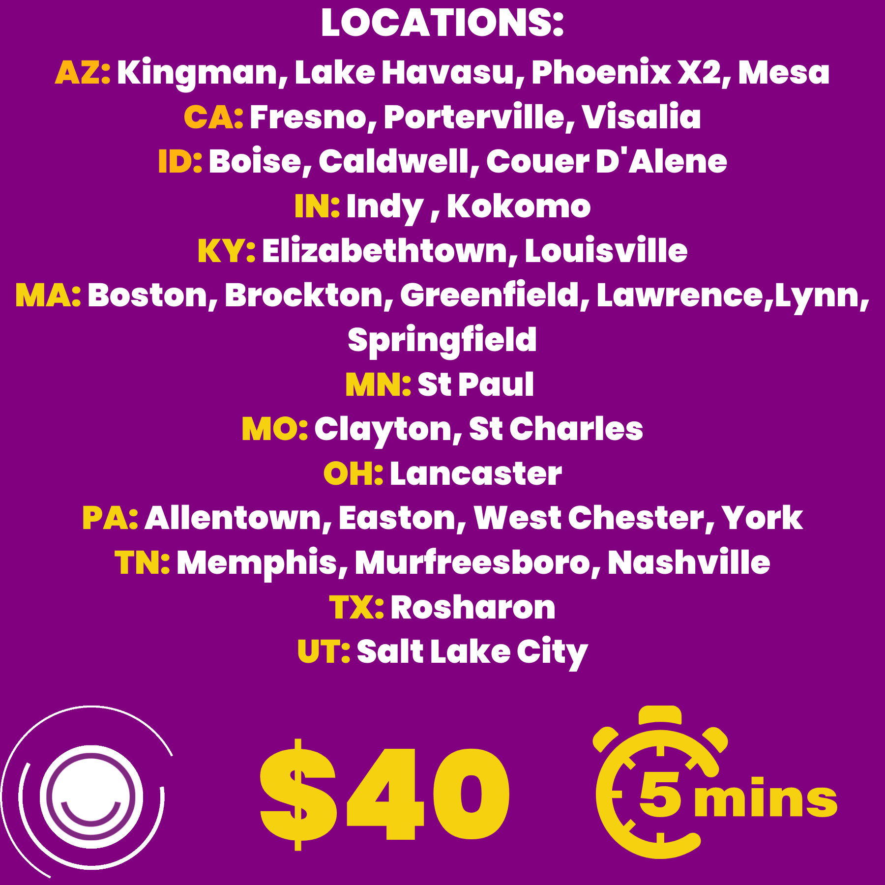 5 Mins $40 Shops AZ, CA, ID, IN, KY, MA, MN, MO, OH, PA, TN, TX, UT