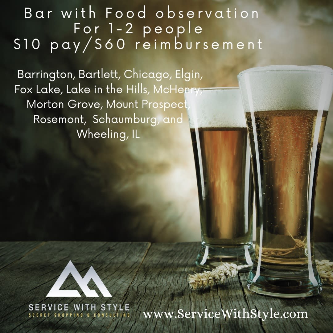 Monthly shops for both bar with food or dinner shops at an Italian/pizza restaurant. The bar visit can be done solo, dinner requires two people. You'll be evaluating the service, food, and cleanliness - and for bar shops a mixed drink needs to be ordered.